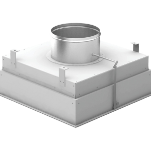 Воздухораспределитель с боковым расположением круглого патрубка с уменьшенными размерами по высоте для подвесных потолков типа «Армстронг».